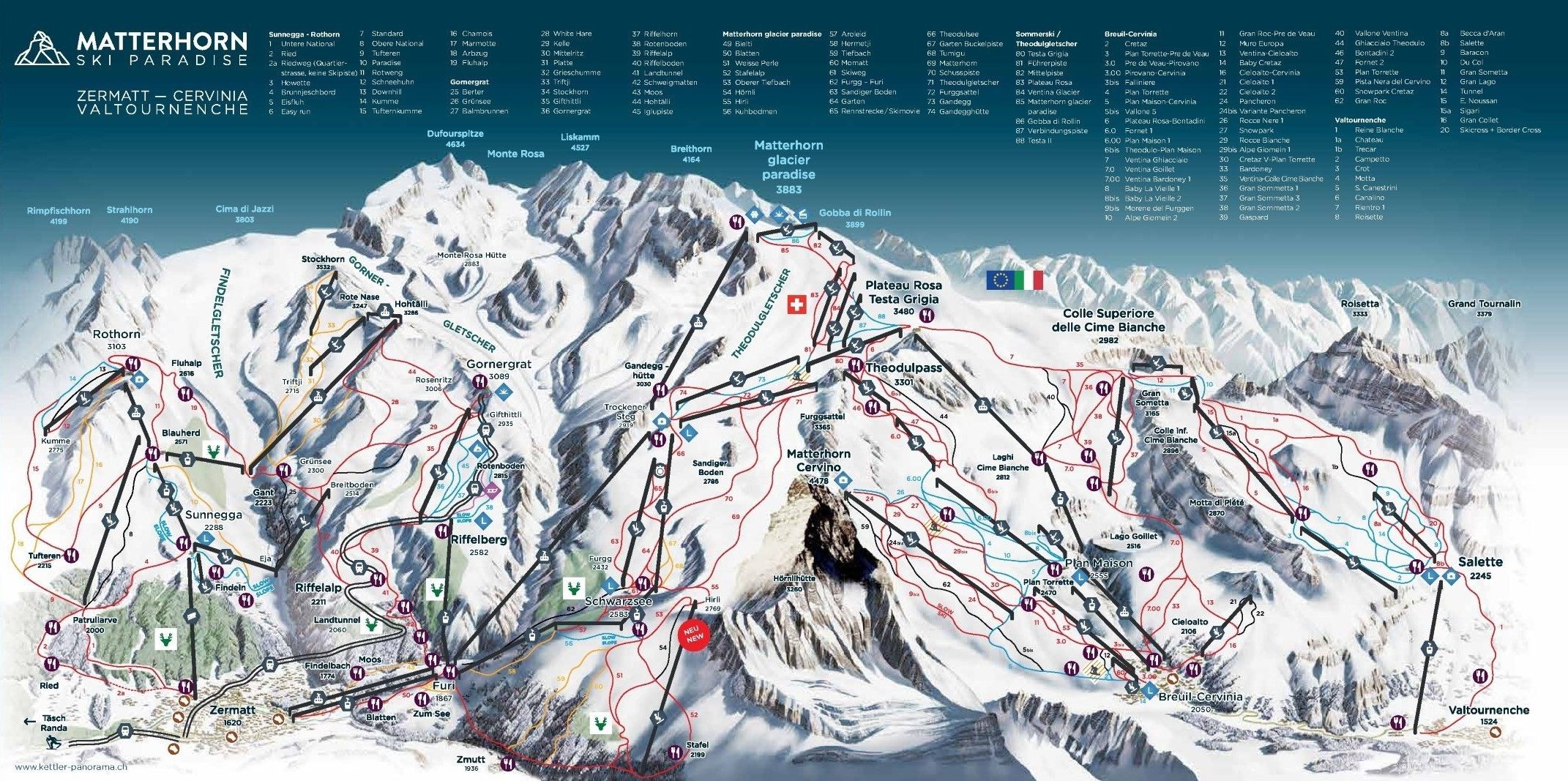 Das Skigebiet Breuil-Cervinia zählt zu den höchstgelegenen und schneesichersten Skiegebieten der Alpen. Am Fuße des Matterhorns gelegen, ist es mit dem schweizerischen Zermatt und Valtournenche verbunden. Zusammen gehören die Skiegebiete zu einem der größten in ganz Europa. Auf über 360 Pistenkilometern erwarten Wintersportler perfekt präparierte Abfahrten, moderne Liftanlagen und atemberaubende Ausblicke auf die umliegende Bergwelt. Breuil Cervinia überzeugt mit breiten, langen Pisten für jedes Niveau, gemütlichen Berghütten und italienischem Flair.